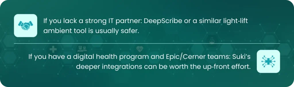 • Suki’s deeper, bidirectional EHR workflows often require more structured rollout; DeepScribe is frequently deployed with lighter IT lift.​