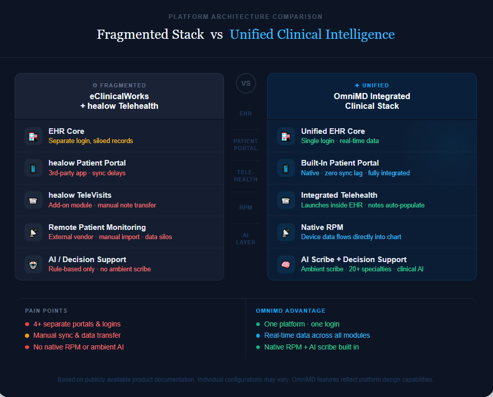 Where eClinicalWorks is extending AI into a legacy suite, we build end-to-end AI rails across front-desk, clinical, financial, and growth workflows.